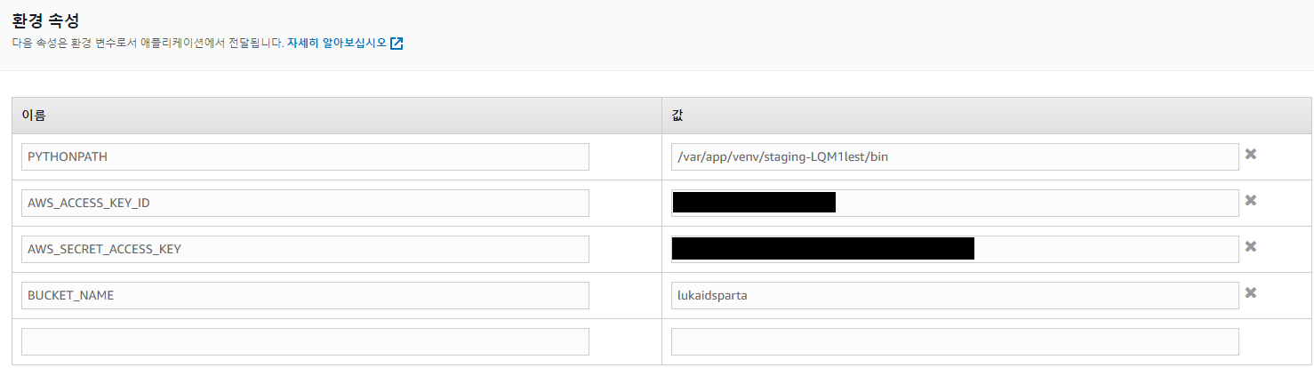 마찬가지로 AWS_ACCESS_KEY_ID, AWS_SECRET_ACCESS_KEY와 BUCKET_NAME를 입력해주자.