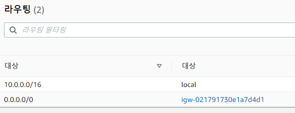 라우팅 테이블은 순서대로 적용되니까 10.0.0.0/16는 로컬로 가고 10.0.0.0/16를 제외한 모든 트래픽은 igw로 간다.